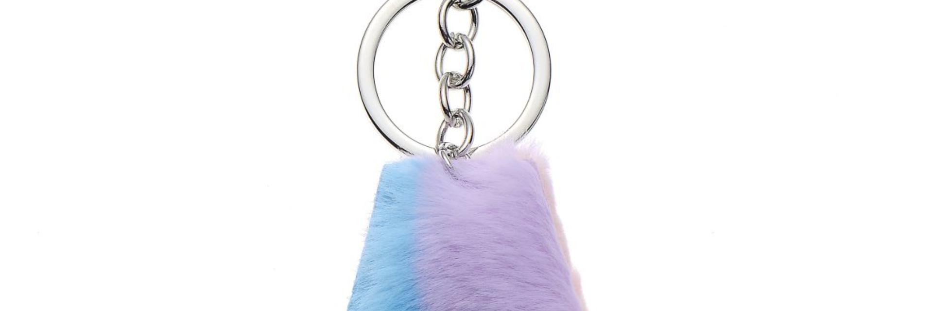 Gulvstativet består av nøkkelringer i plysj i pastell og regnbuefarger.